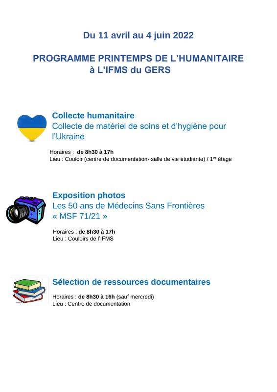 Dans le cadre du Printemps de l'humanitaire qui se déroulera du 11 avril au 3 juin 2022 à l'IFMS du Gers, vous trouverez des ressources numériques en lien avec cet évènement.